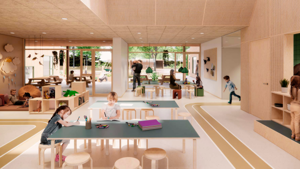 Daginstitutionen opføres som et træbyggeri med træbeklædning, der reducerer CO₂-aftryk og minimerer brugen af traditionelle materialer som beton og stål. Børnehuset indrettes med både vuggestue- og børnehaveafsnit, hvor arkitektur og funktionalitet er nøje tilpasset børnenes behov. Store vinduespartier sikrer et godt lysindfald, mens grønne tage, varmepumper og solceller bidrager til et lavt energiforbrug.