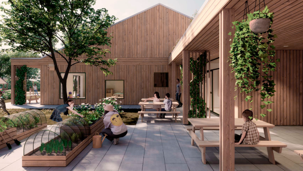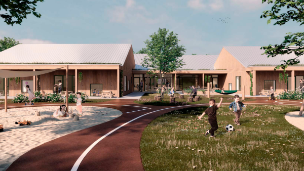 Byggeriet er placeret tæt på Trællerup skole og bliver et naturligt samlingspunkt for lokalsamfundet. Udendørsarealerne indrettes med leg og læring i fokus og skaber en flydende overgang mellem inde- og uderum.