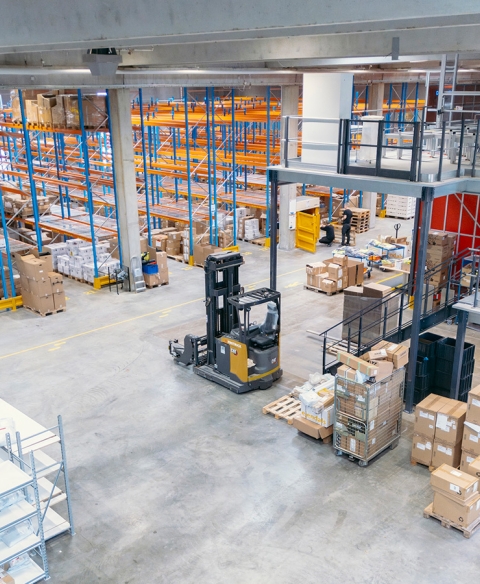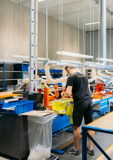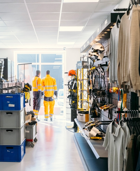 Byggeriet består af 1.400 m2 administration, showroom og butik i to etager samt et højlager på 3.200 m2 i 8 meters højde med AutoStore Anlæg, trykkeri og serviceafdeling for faldsikringsudstyr.