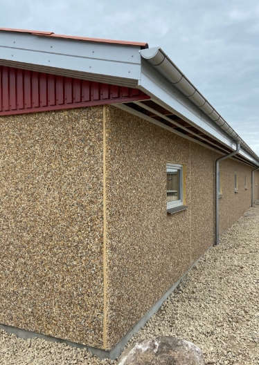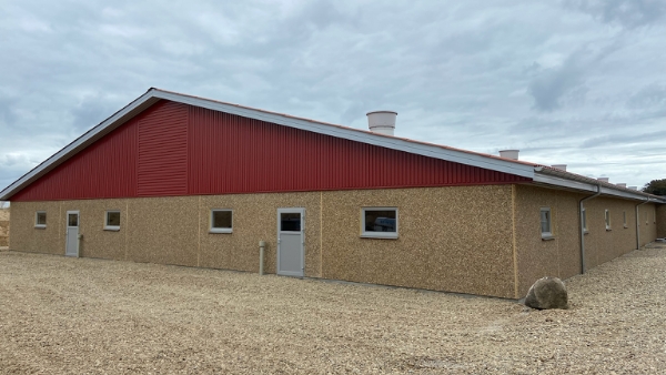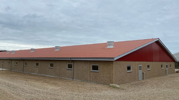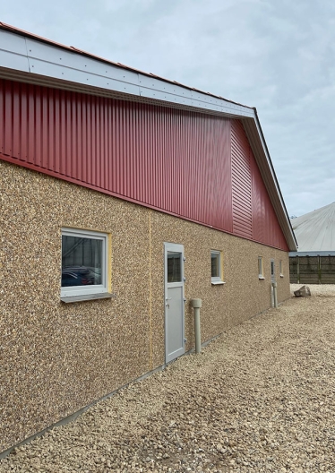 Stalden er opført i sandwichelementer med frilagte bakkesten, og tagkonstruktionen er udført i gitterspær.