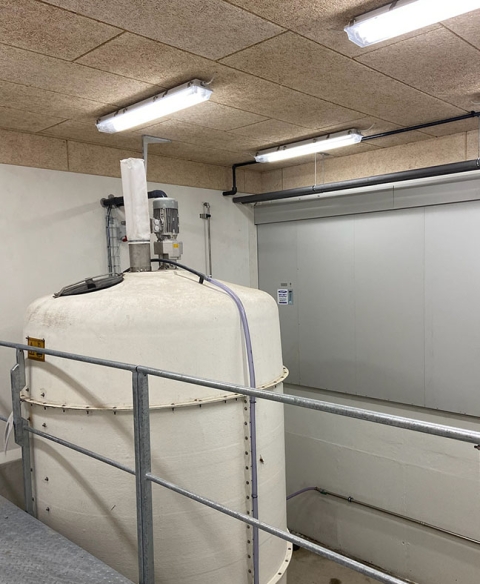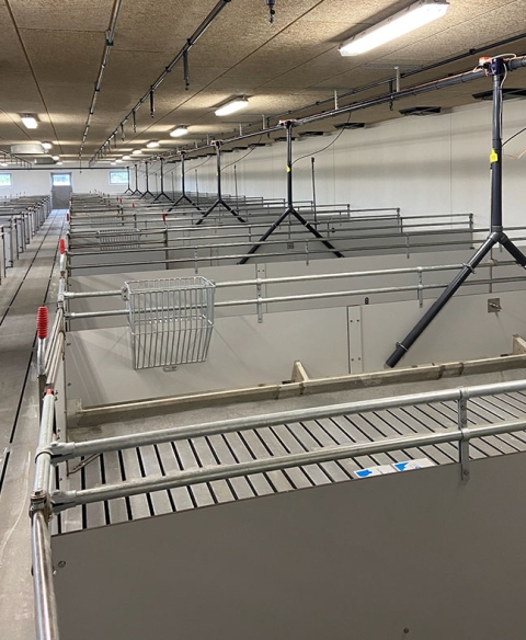 Stalden er opført med gulvudslug, som trækker dele af luftmængden ned under gulvet og videre ud til to kemiske luftrensere. Derved sikres en god luftkvalitet for både dyr og medarbejdere.