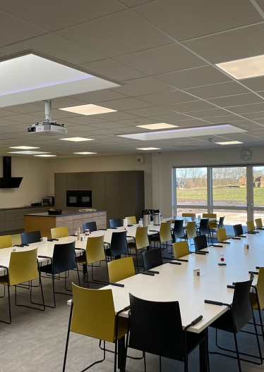 Den grønne omstilling er også tænkt ind i projektet, hvor bygningen er opvarmet med luft/vand varmepumper kombineret med solceller på taget, som bidrager til bygningens energiforsyning.