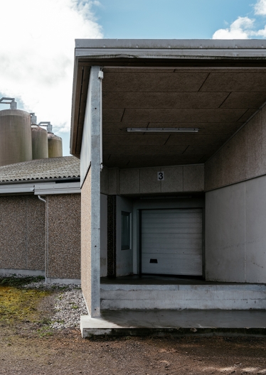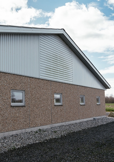 Stalden er opført i betonelementer med en facade af bakkesten. Tagkonstruktionen er udført i trægitterspær og belagt med cementbølgeplader.