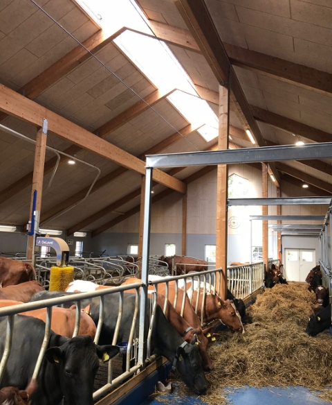 Vi har valgt å bygge i tre, fordi det gir en god atmosfære, og resultatet viser, at Gråkjær vet, hva de driver med. Vi er veldig godt fornøyde med det nye fjøset.